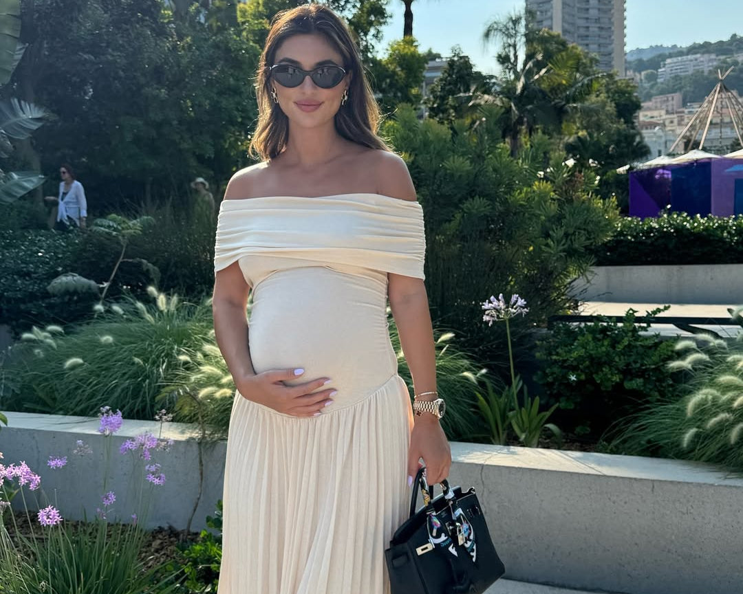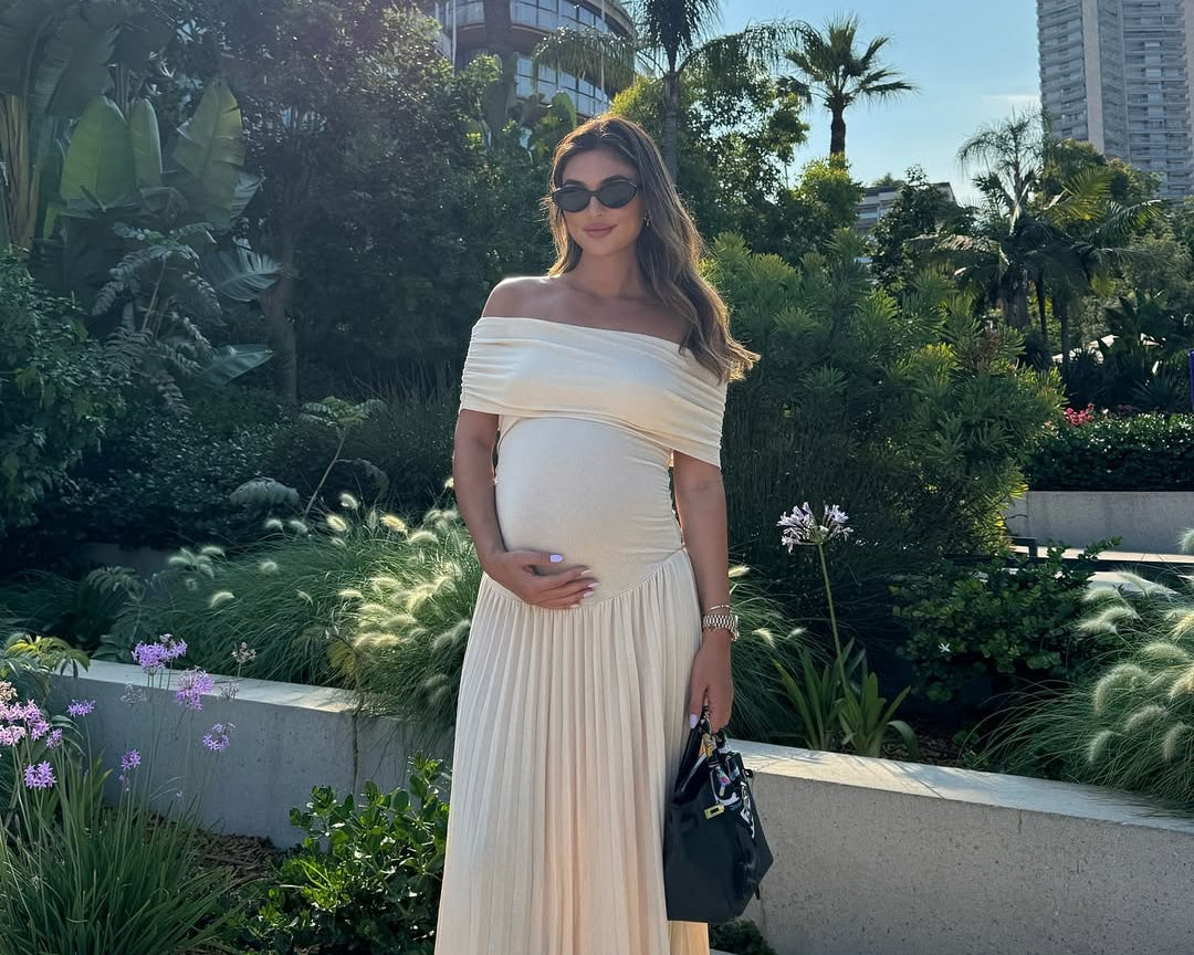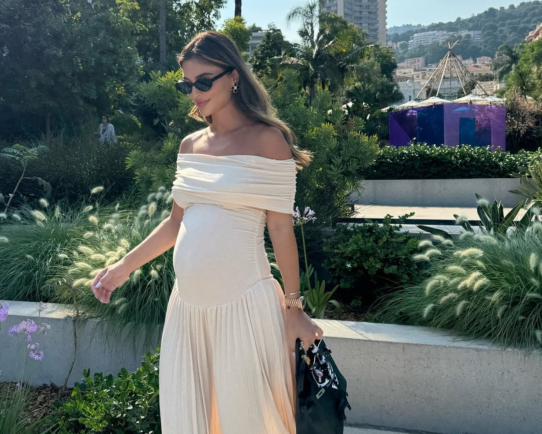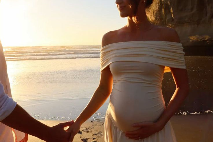 High-rise waist seam: Gently defines the silhouette above the bump for a graceful line.