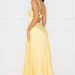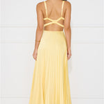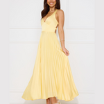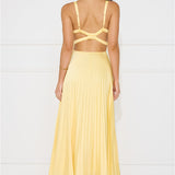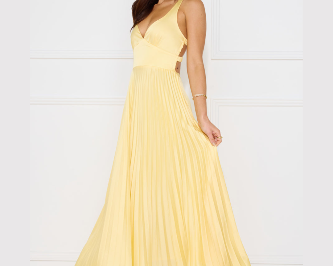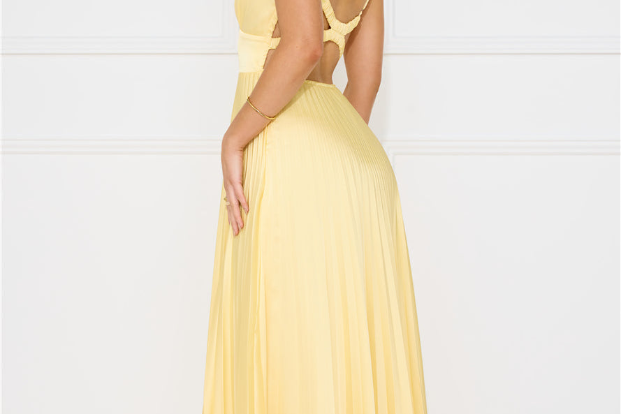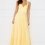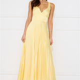 The Amelia Chic Sunlit Gown captures the lightness of summer with every graceful detail. Designed with a plunging V-neckline and airy pleated skirt, this maxi dress moves effortlessly whether you’re twirling at a garden wedding or soaking up golden hour at an outdoor celebration. The open back with subtle elastic accents adds a touch of allure while ensuring ease throughout the day.