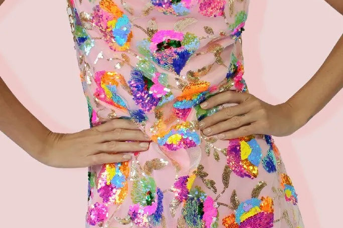 Sequin-adorned fabric: Sparkles vividly under light for high-impact shine.