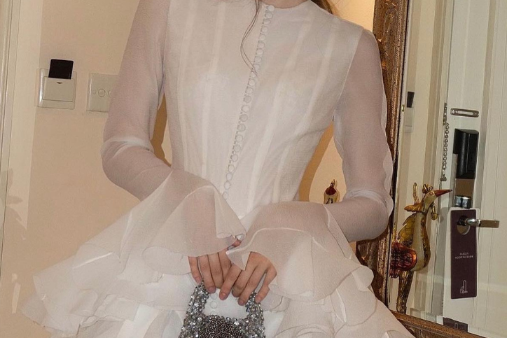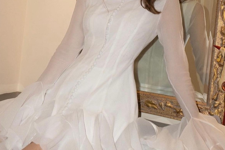 Oversized sleeves – Adds structure and subtle drama to balance the dress’s playful flow.