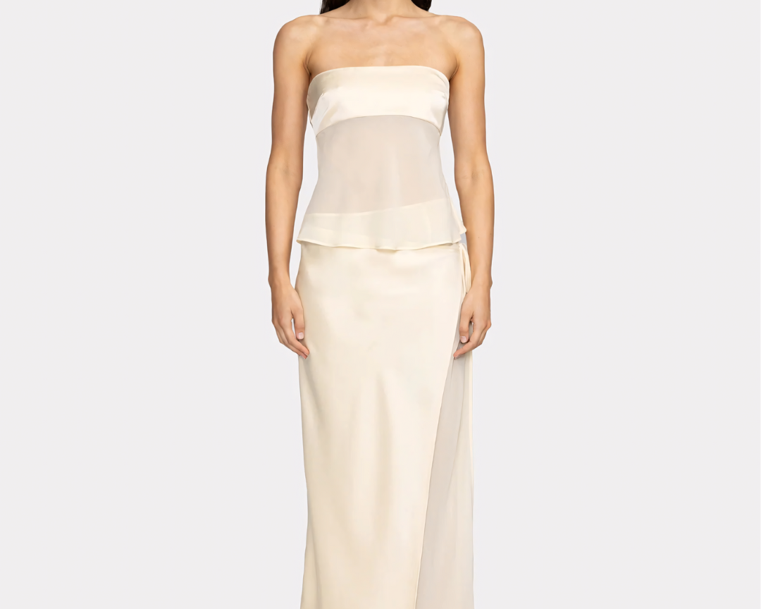 Step into refined drama with the Fideline Ivory Sheer Gown — a strapless showpiece designed to flow like poetry in motion. Featuring translucent layering, sculpted draping, and a daring thigh-high slit, this gown captures light and silhouette with subtle sensuality. Whether you're attending a candlelit event or walking into an opulent celebration, Fideline promises a vision that lingers.