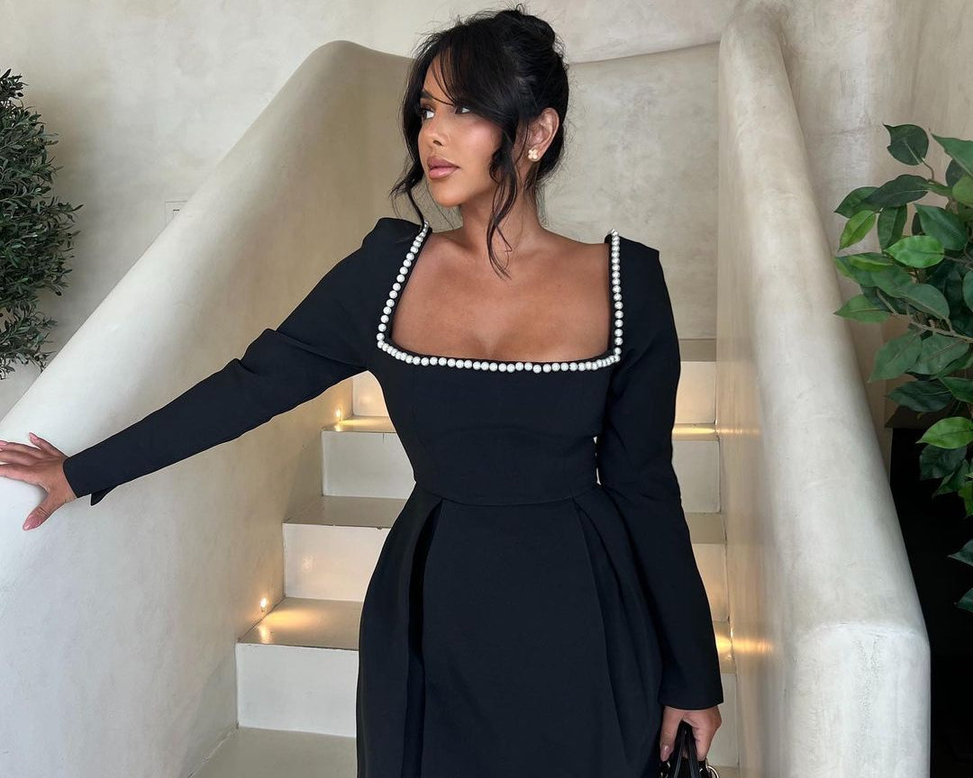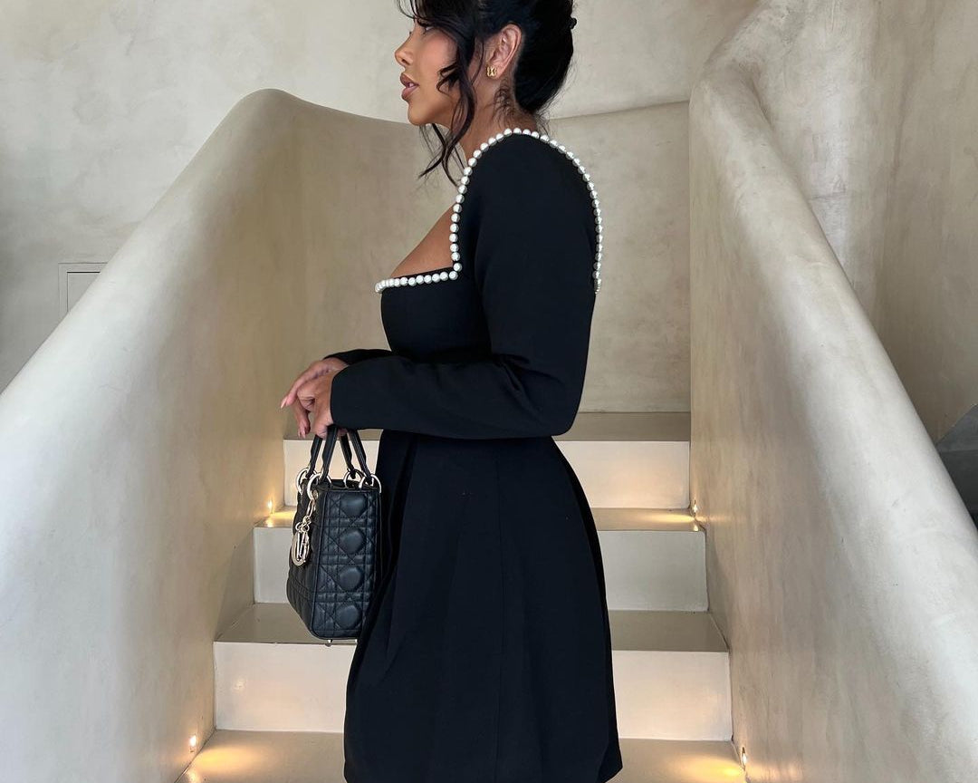 Pearl-framed neckline: Tiny pearls contour the collar, offering soft luminosity without overpowering the look.