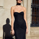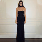 Strapless structure with collar: Frames your neckline with sharp, sculpted contrast.