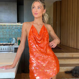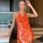 Pia was made for evenings that call for radiance. Its shimmering halter neckline and playful mini length strike the perfect balance between allure and energy, while the open back invites a hint of daring charm. From rooftop soirées to sunset escapes, this dress makes every step a show of light and movement.