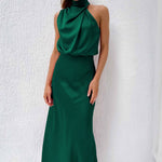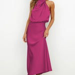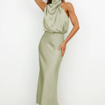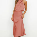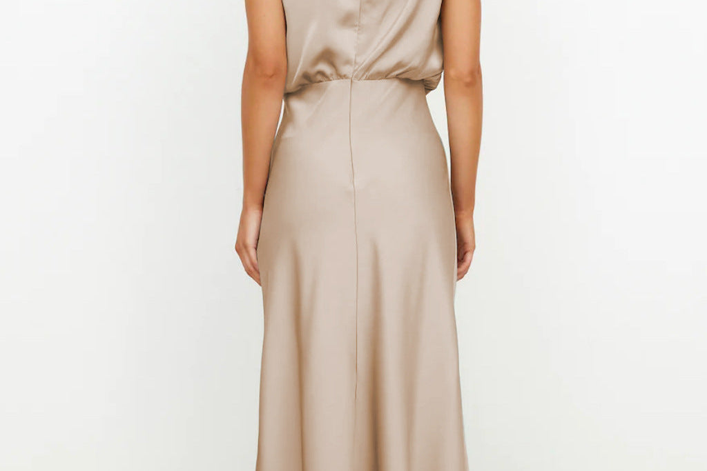 The Quentin dress speaks in soft volumes — flowing, sculpted, and intentionally poised. Its high neckline adds a regal note, while the draped silhouette glides with each step. Whether you're toasting under the stars or arriving fashionably late, this piece delivers presence with ease.