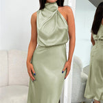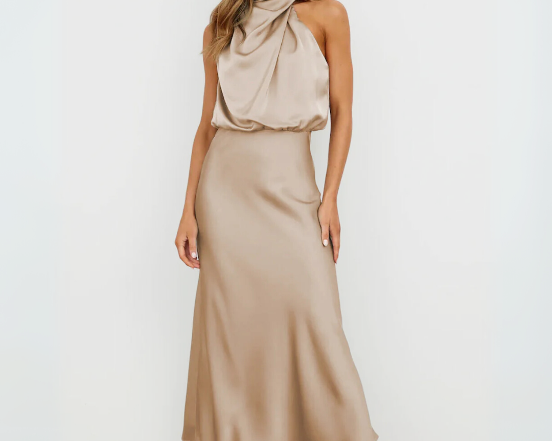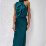 High neck drape: Frames the collarbone and neck for a refined, statuesque effect.