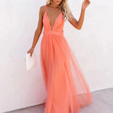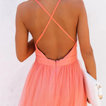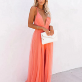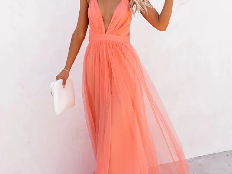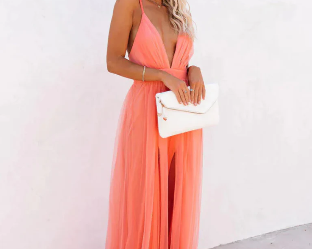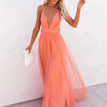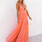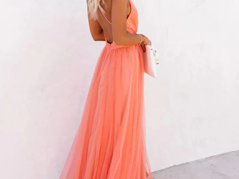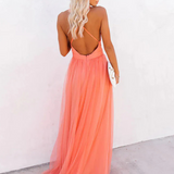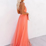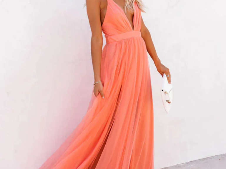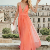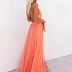 Wrap yourself in a dream with the Vesper Gown — a coral-pink masterpiece that floats like dusk light. Designed in airy layers of fine tulle, its A-line shape and softly defined waist create a poetic silhouette that moves like a breeze. Ideal for summer soirées, barefoot beach nights, or starlit dinners, this gown glows with warmth and whimsy.